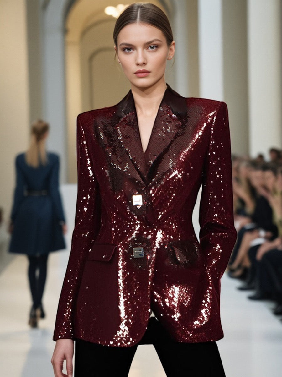 This early-fall sequin blazer brings a refined blend of elegance and modern design. The V-neckline highlights the collarbone, creating a clean and elongated upper-body silhouette, while the tailored waist subtly enhances curves for a naturally slimming effect. The shimmering sequin surface adds eye-catching texture without overwhelming the look, making it suitable for both daytime styling and evening occasions. The structured shoulder line elevates presence and adds confidence to every outfit. Pair it with trousers, skirts, or a sleek inner layer for a polished, fashion-forward ensemble perfect for transitional seasons.