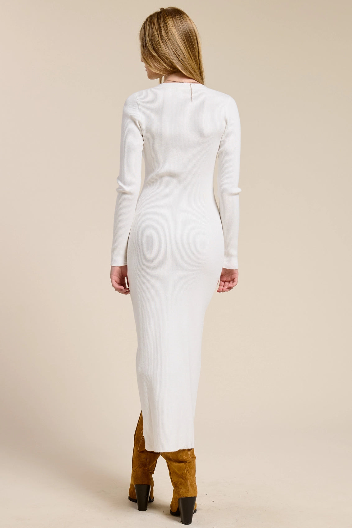 Made from a solid ribbed knit, this longline cardigan dress features a deep V neckline with asymmetric button detailing on one side, long sleeves, and a full button-down front with contrast buttons. The body-hugging silhouette and front slit add a sleek, modern edge.